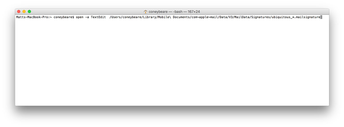 ubiquitout_XXXXXXX.mailsignaturefile that represents it. This placeholder now should be open in TextEdit.If you have more than one